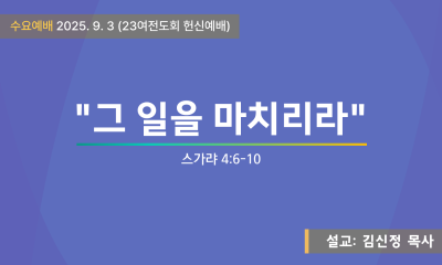 하나님의 꿈을 함께 이루어가는 믿음의 가족, 선두교회입니다. 홈설교ㆍ찬양설교 설교 주일오전주일오후열린 분류 수요새벽기도회 검색어 필수 설교, 예배명, 설교자, 성경 키워드를 입력해주세요. 검색 전체 284건 수요 "알맹이" 설교자 박상윤 목사 날짜 2025-09-10 동영상 바로보기 수요 "그 일을 마치리라" 설교자 김신정 목사 날짜 2025-09-03 동영상 바로보기 수요 “미스바의 기도” 설교자 조형래 목사 날짜 2025-08-27 동영상 바로보기 수요 “( ) 떨어져도 낙심하지 말 것은...” 설교자 박상윤 목사 날짜 2025-08-13 동영상 바로보기 수요 “우리를 시험하시는 하나님” 설교자 최희락 목사 날짜 2025-08-06 동영상 바로보기 수요 “감사 ? 일상의 기적” 설교자 최석제 목사 날짜 2025-07-30 동영상 바로보기 수요 "마음 다해 나의 하나님을 노래하자!" 설교자 김두진 목사 날짜 2025-07-23 동영상 바로보기 수요 "두려워 말고 믿기만 하라" 설교자 조형래 목사 날짜 2025-07-16 동영상 바로보기 수요 "미소현고" 설교자 김신정 목사 날짜 2025-07-09 동영상 바로보기 수요 "찐 사랑" 설교자 최석제 목사 날짜 2025-07-02 동영상 바로보기 수요 "어떻게 먹이겠느냐" 설교자 박영준 전도사 날짜 2025-06-25 동영상 바로보기 수요 "처절한 죄인을 살리는 길" 설교자 박상윤 목사 날짜 2025-06-18 동영상 바로보기 처음 이전 1페이지 2페이지 3페이지 4페이지 5페이지 6페이지 7페이지 8페이지 9페이지 10페이지 다음 맨끝